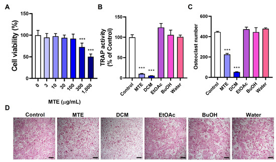 Effects of MTE and its fractions on osteoclast differentiation. (A) Cell viability of BMMs treated with MTE ranging from 0 to 1000 μg/mL for 24 h, assessed via the CCK-8 assay. (B–D) BMMs were incubated with MTE and its fractions at 10 μg/mL in the presence of M-CSF (60 ng/mL) and RANKL (50 ng/mL) for 3 days: (B) Total cellular TRAP activity, (C) Enumeration of osteoclasts, and (D) Representative TRAP-stained cell images (scale bar, 100 µm). *** p < 0.001 versus control. Abbreviations: DCM, dichloromethane; EtOAc, ethyl acetate; BuOH, butanol.
