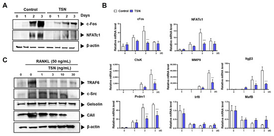 TSN-mediated modulation of osteoclastogenic markers. BMMs were cultured in the presence or absence of RANKL (50 ng/mL) and TSN (30 ng/mL) for 3 days. (A) Protein expression of c-Fos and NFATc1 during osteoclast differentiation with or without TSN. (B) mRNA expression of selected genes during osteoclast differentiation in the presence or absence of TSN. (C) Protein expression of TRAF6, c-Src, and CAII in BMMs exposed to varying concentrations of TSN (1–30 ng/mL) in the presence of RANKL for 3 days. * p < 0.05, *** p < 0.001 versus control not treated with TSN.