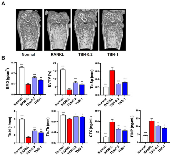 Upon determining the inhibitory potential of TSN on osteoclastogenesis and its anti-resorptive activity, we further assessed its therapeutic efficacy in a mouse model of RANKL-induced bone loss. As documented by Tomimori et al. [28], daily intraperitoneal injections of RANKL for three days in female C57BL/6J mice precipitated a rapid decline in trabecular bone mass, evident a day post the final RANKL administration (Figure 6A). Subsequent micro-CT evaluations indicated pronounced reductions in the trabecular bone mineral density, bone volume, number, and thickness, accompanied by augmented trabecular separation within the femoral bone following RANKL challenge. Notably, treatments with TSN (administered at doses of 0.2 and 1 mg/kg/day) substantially mitigated these bone deteriorative changes (Figure 6B).