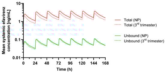 Simulated concentrations of total (red) and unbound (green) efavirenz in a nonpregnant population (NP; solid lines) and during the 3rd trimester of pregnancy (dashed lines). A dosing regimen of 600 mg of efavirenz per day for seven days was used.