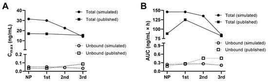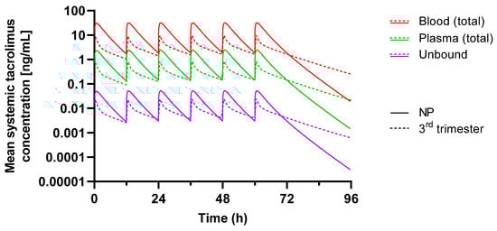 A PBPK model was previously developed and used to simulate the total and unbound systemic plasma and blood exposure of tacrolimus in nonpregnant and pregnant populations during the first, second, and third trimester []. The observed and simulated clinical PK data for tacrolimus are presented in Table 2. Figure 3 shows the simulated tacrolimus (total and unbound) plasma and blood in the pregnant, third trimester, and nonpregnant population, and Figure 4 shows the changes over the different trimesters. Unbound concentrations represent both blood and plasma, as these are expected to be at equilibrium.