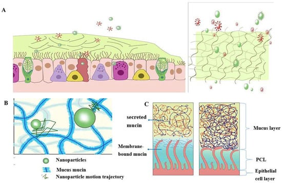 Schematic diagram of the structure and function of the mucus barrier: (A) The mucosal cilia clearance system has three main components: the surface fluid layer in contact with the airway lumen, the periciliary fluid layer that supports cilia beating, and the respiratory epithelium, composed of secretory cells. Constantly renewing the mucus blanket avoids the retention of pathogenic bacteria while removing pathogenic microorganisms (red spheres) and inhaled particulate matter (green spheres); (B) Schematic diagram of nanoparticle structure through mucin network. Small molecules can cross the mucus barrier by free diffusion, but most large molecules do not readily cross the mucus barrier; (C) Schematic diagram of PCL collapse due to dehydration of the mucus and PCL layers and the airway under normal conditions.