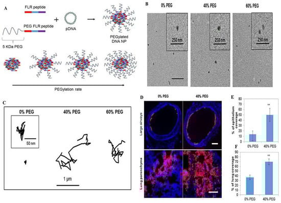 PEGylated enhanced cell-penetrating peptide nanoparticles for lung gene therapy: (A) Schematic of non-PEGylated and PEGylated FLR peptides blended at different molar ratios to form D.N.A. NPs with a tuneable coating of PEG on the outer surface; (B) Representative transmission electron micrographs of the respective NPs; (C) Representative trajectories of particles moving through CF sputum; (D) Representative images of NP distribution in large airways and lung parenchyma following administration of the respective NPs (red). Image-based quantification of (E) coverage of NPs in large airways and (F) distribution of NPs in the lung parenchyma. Error bars indicate SD, n = 3 mice/group (>30 sections were analysed per mouse). Two-tailed Student’s t-test, ** p < 0.01. Reproduced with permission [1]. Copyright 2018, Elsevier.
