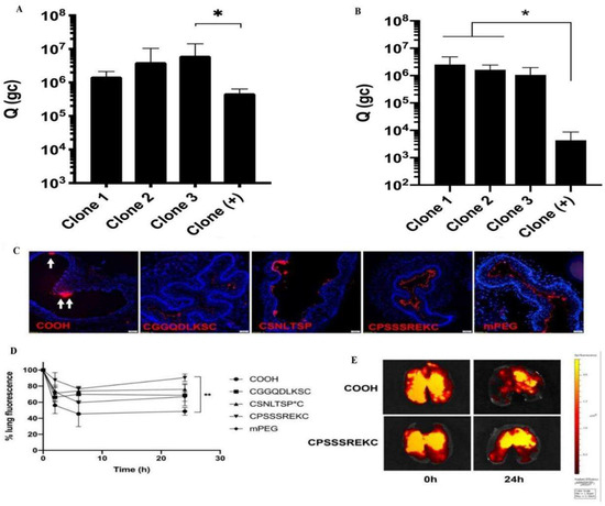 Peptides as nanoparticle surface coatings for the treatment of cystic fibrosis. Amount of phage clones that permeate across (A) CF mucus model, (B) CF sputum from patients. (C) Tracheal distribution at 30 min after administration (n = 3). (D) Retention in the entire lung over time. The retention percentage is reported as the percentage of the initial fluorescence for each nanoparticle after administration. (E) Representative images of the mouse lungs harvested at varying times after intratracheal administration of uncoated and mucus-penetrating CPSSSREKC-conjugated PS nanoparticles. Data represents mean ± SD (n = 3). Kruskal-Wallis test with post hoc Dunn’s multiple comparisons, * p < 0.05, ** p < 0.01; (B) p = 0.067 Clone 3 vs. Clone (+). Reproduced with permission [72]. Copyright 2020, Elsevier.