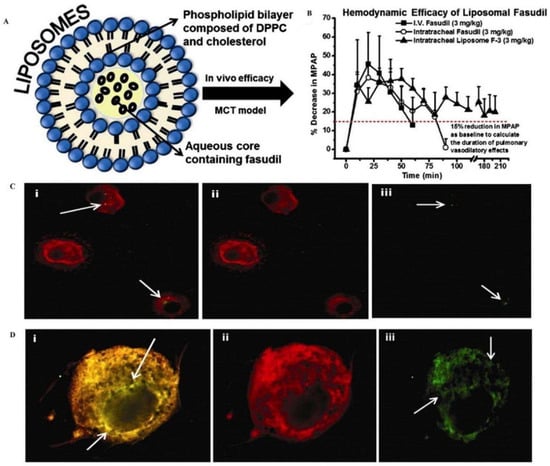 Liposomal fasudil is used in the treatment of pulmonary hypertension. (A) Schematic representation of the liposome preparation. (B) mean pulmonary arterial pressure (M.P.A.P.) [horizontal dashed line (----) represents a 15% reduction in M.P.A.P.]. Intracellular uptake of liposomes containing fasudil by (C) rat alveolar macrophages and (D) rat pulmonary arterial smooth muscle cells. Reproduced with permission [49]. Copyright 2013, Elsevier.
