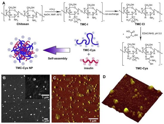 Synthetic route of TMC-Cys and schematic representation of the formation of self-assembled TMC-Cys NP (A) and SEM (B) as well as AFM (C,D) images of TMC-Cys(200,30) NP. C corresponded to the phase image, while (D) corresponded to the three-dimensional image [91]. Copyright 2009, Elsevier.