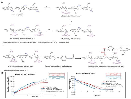 Mannose-anchored N, N, N-trimethyl chitosan nanoparticles for pulmonary administration of etofylline. (A) The scheme of synthesis of N, N, N-trimethyl chitosan chloride (TMC) (* product from the first step; ** product from the second step) and mannosylated N, N, N-trimethyl chitosan chloride (MnTMC). (B) Mathematical models demonstrating the drug release kinetics from ETO-TMC-TPP and ETO-MnTMC-TPP NPs. Reproduced with permission [55]. Copyright 2020, Elsevier.
