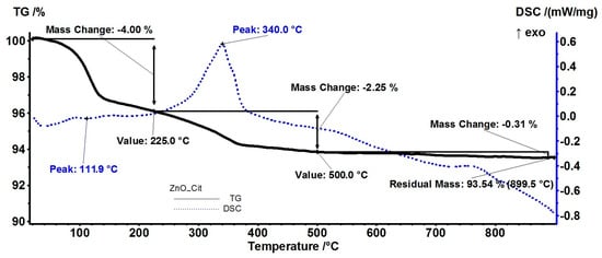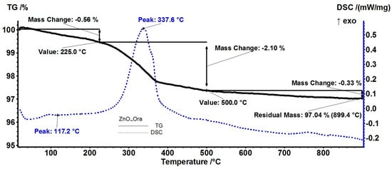 The thermal analysis of the ZnO_Cit sample presented a mass loss of 4.00% up to 225 °C accompanied by an endothermic effect with a minimum of 111.9 °C, indicating a desorption process (Figure 6). The upper part of the FTIR 2D projection presents the FTIR spectrum of the evolved gases at 115 °C, which could be assigned to the citronellal component [66]. The other less volatile components—geraniol, geranylacetate, and elemol—were eliminated in the second temperature interval of 225–500 °C, by oxidation and degradation, with a recorded mass loss of 2.25% [67]. An exothermic effect was associated with this process, with a maximum peak at 340.0 °C, indicating the presence of oxidative reactions. The FTIR 2D and 3D diagrams of evolved gases indicated the presence of carbon dioxide and water vapors in this temperature interval. On the right side of the FTIR 2D projection, there is a trace for hydrocarbon fragments (wavenumber 2925 cm−1) which presents a small peak at 350 °C indicating that fragmentation reaction also took place in this temperature interval. The estimated load of citronella essential oil was ~5%.