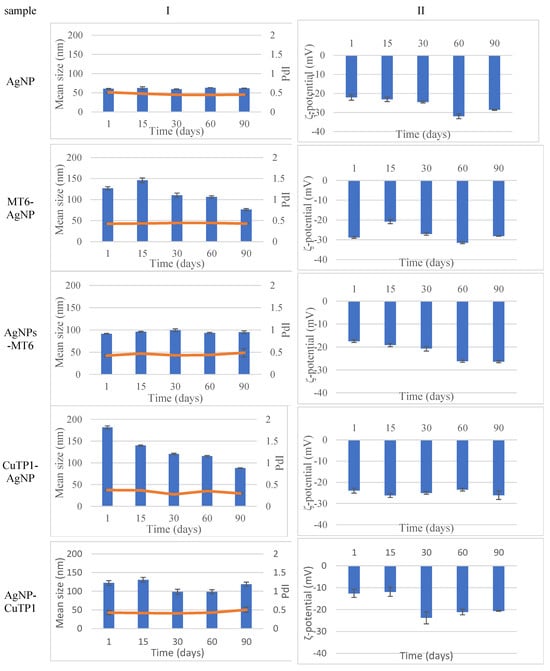 Stability study monitoring mean size (I) and ζ-potential (II) of silver nanoparticles for 90 days.