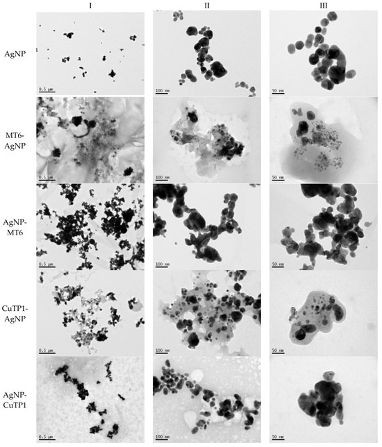 MT6-AgNP and CuTP1-AgNP had much higher hydrodynamic diameters (p < 0.005) than their respective AgNP MT6 and AgNP CuTP1.