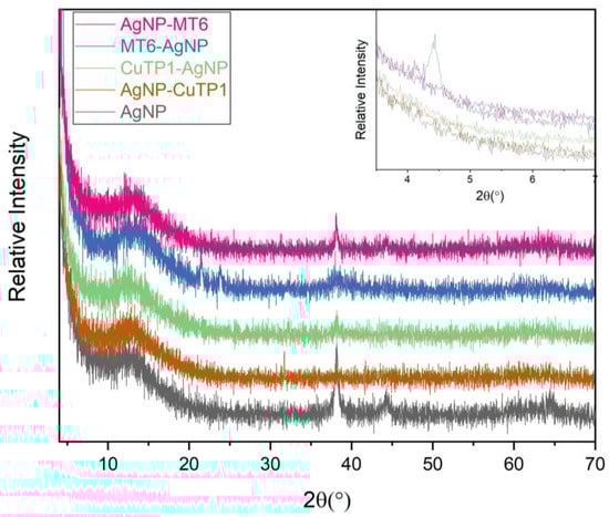 The characteristic peak of silver nanoparticles was observed at around 38.13°, corresponding to (111) plane, which is in agreement with the available literature [,]. The peak is not intense in AgNP-CuTP1 due to the small percentage of AgNP in the composite (13.14 ± 2.01% yield), as it was calculated also using UV–vis spectrophotometry (see Table 1). In the case of pure AgNP, the characteristic peak of silver at 44.32° is also visible. The XRD patterns of peptide–AgNP conjugates (MT6-AgNP, AgNP-MT6, CuTP1-AgNP, AgNP-CuTP1) do not present such intense peaks of silver due to the interaction of silver particles with organic-nature materials. The broad peak between 10° and 20° 2θ is characteristic for the pure crystalline phase, almost amorphous of NaBH4 structure, that was used for the nanocomposite synthesis. This is in agreement with the available literature for the investigation of pure phase of NaBH4. The sharp peaks of NaBH4 are missing due to the lack of high crystallinity in the remaining NaBH4 []. The peaks at about 21° and 24° 2θ in the sample MT6-AgNP are an indication of the remaining particles of AgNO3 after the synthesis procedure. These peaks frequently appeared in XRD patterns of silver nanoparticles where AgNO3 was used []. The presence of new peaks at small angles is observed in the XRD patterns of MT6-AgNP and AgNP-MT6, while it is more intense in the case of MT6-AgNP. This result may be explained by the difference in the structure of MT6-AgNP compared to the other synthesized nanoparticles as was revealed from SAED patterns. The presence of an intense peak at 4.44° may reflect this structural variation.