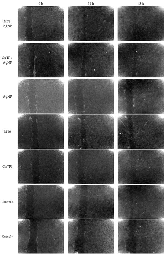 Wound healing is a rather complicated process in which the migration of fibroblasts plays an important role []. Our results, for the very first time, demonstrated that both peptide–AgNP conjugates (MT6-AgNP, CuTP1-AgNP) can more prominently promote cell migration and therefore wound healing (p < 0.05) compared to the corresponding free peptides (MT6, CuTP1) or peptide-free AgNP. The wound healing effect was similar for both free peptides and did not differ significantly compared to the control+ (p > 0.05). The results demonstrated that the incubation of fibroblasts with peptides conjugated with silver nanoparticles showed a high migration rate, which is indicative of both the active proliferation and growth of the fibroblasts. This observation may stem from the expression of a contractile element in the fibroblasts such as myofibroblasts that may be the product of fibroblast differentiation caused by the application of silver nanoparticles []. Also, the enhanced performance of peptide–AgNP conjugates compared to the individual ingredients may be due to more efficient peptide targeting as peptide–AgNP conjugation may lead to the increase in local concentration of peptides []. Previous reports have emphasized that antimicrobial peptide–AgNP conjugates may serve as effective safe antimicrobial materials for wound treatment [,,].