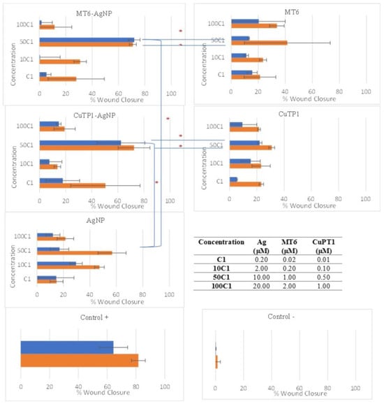 Scratch area reduction percentage (% wound closure) caused by incubation of fibroblasts with peptide–AgNP conjugates, the corresponding free peptide, conventional AgNP and positive (Control+) and negative (Control−) controls at 24 (■) and 48 (■) h. Statistical significance is denoted by * (p < 0.05).