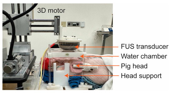 Picture of the FUS setup for pigs. The head was stabilized by head supports. The FUS transducer was positioned next to a 3D motor to target the desired brain regions. The transducer was coupled to the pig’s head using a water chamber.