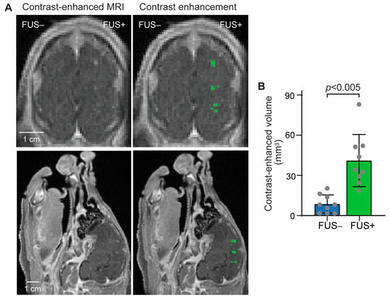 Contrast-enhanced MRI confirmed FUS-BBBO in the pig brain. (A) Left: Representative contrast-enhanced T1-weighted MRI image in the coronal and sagittal planes; Right: Pixels with higher contrast enhancement than the contralateral side were identified and highlighted in green. (B) The contrast-enhanced volume was significantly increased. Each dot represents the measurement at one targeted brain region. Error bars indicate standard deviation.