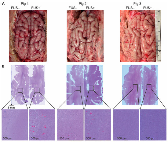 Ex vivo safety assessment. (A) The gross pathology examination of the post-craniotomy brain surface in the three pigs revealed no obvious tissue damage induced by the FUS procedure. (B) Hematoxylin and eosin (H&E) staining of the sonicated- and nonsonicated-brain tumor tissue identified microhemorrhages in six of the nine target regions.