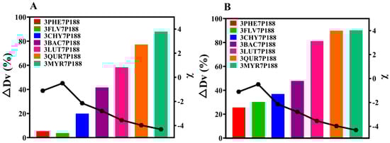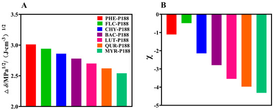 To assess compatibility, we utilized the difference in partial solubility parameters, Δδp, between drugs and P188. A smaller Δδp signifies closer alignment of partial solubility parameters between the drug and polymer, indicating better compatibility (∆δ < 7.0 MPa1/2) [50]. As shown in Figure 2A, flavonoid drugs exhibit good miscibility with P188. Moreover, as the number of hydroxyl groups increases, the compatibility gradually improves, with the order of compatibility being MYR-P188 (2.54) > QUR-P188 (2.62) > LUT-P188 (2.70) > BAC-P188 (2.78) > CHY-P188 (2.86) > FLV-P188 (2.94) > PHE-P188 (3.01 (Jcm−3)1/2).
