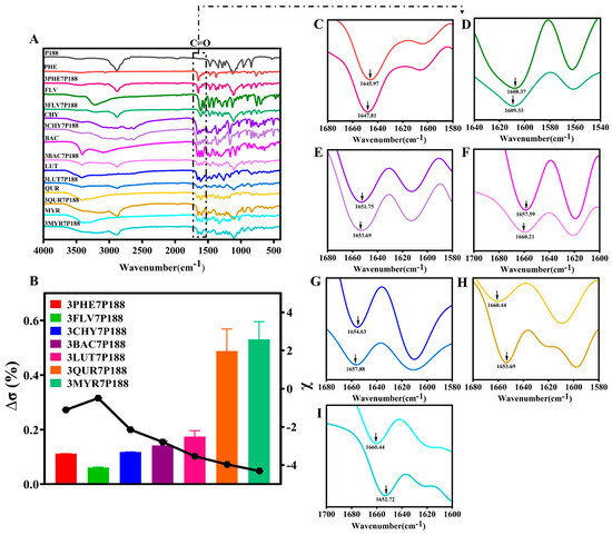 Compared to pure flavonoid drugs, the CSD system with a drug loading of 30% exhibits more noticeable shifts in the -C=O peak position (indicated by black arrows in Figure 4). Calculating the percentage change in the shift ratio of the carbonyl peak (∆σ (%)) reveals a positive correlation between the number of hydroxyl groups and interactions within the CSD system, with the following magnitudes: MYR (0.5301 ± 0.0652%) > QUR (0.4876 ± 0.0811%) > LUT (0.1746 ± 0.0218%) > BAC (0.1420 ± 0.0160%) > CHY (0.1180 ± 0.0050%) > PHE (0.1120 ± 0.0002%) > FLV (0.0690 ± 0.0012%). This suggests that flavonoid drugs may form hydrogen-bonding interactions (-C=O⋯H-O) with P188.