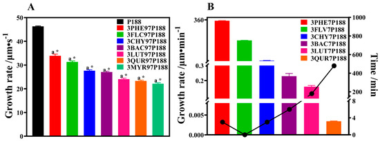 The growth rate of flavonoid drug crystals with P188. (The line graph in (B) indicates the time of appearance of the crystalline nuclei of the drug). (A): Crystallization growth rate of P188 with flavonoid drugs included at 3%; (B): Crystallization growth rate of flavonoid drugs included at 30%. a: p < 0.01 compared to P188; *: A chi−square trend test was used for linear associations between flavonoid drugs, p < 0.01.
