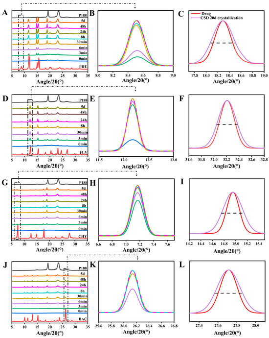 We utilized PXRD to study the crystallization kinetics and crystalline domain size changes of flavonoid drugs in CSDs. Firstly, it was evident by PXRD that no transcrystallization occurred in CSDs for several flavonoids, which ensured the consistency of the evaluation. Except for MYR-CSDs, crystalline nuclei appeared in the mixture for all other CSDs within five days. In the CSD system with a drug loading of 30%, notable differences in the crystallization rates of various flavonoid drugs were observed. Crystalline nuclei appeared in the mixture for FLV, PHE, CHY, BAC, LUT, and QUR at 0 min, 3 min, 3 min, 6 min, 3 h, and 8 h, respectively, and MYR showed no crystalline nuclei within five days, indicating that more extensive interactions result in slower drug crystallization. It must be explained that, in such systems, different dynamic processes compete, and the more different interactions are possible, the slower the equilibrium is achieved [67].