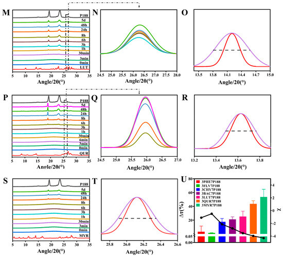 According to Scherrer’s equation (Equation (6)), the decrease in the size of crystalline domains can make the PXRD diffraction peaks broader. In the previous study of our group, the researchers also used Scherrer’s equation several times to confirm the relationship between the reduction in drug crystalline domain and crystallite size in CSDs [24]. After leaving the CSDs mentioned above at room temperature for 20 days until complete crystallization, we conducted a PXRD analysis and calculated changes in crystalline domain size. The results revealed a trend of decreasing crystalline domain size for all drug compounds within the CSDs, with a more significant decrease in crystalline domain size associated with increased interactions. The percentage change in crystalline domain size (∆τ (%)) (Equation (9)) was found to be directly proportional to the interactions (Figure 6U). The trends in crystalline domain size change for flavonoid drugs within the CSD systems were as follows: MYR (53.56 ± 15.76%) > QUR (43.56 ± 6.47%) > LUT (24.29 ± 10.75%) > BAC (21.18 ± 5.12%) > CHY (17.63 ± 6.77%) > PHE (3.271 ± 11.585%) > FLV (1.491 ± 0.47%). FLV exhibited anomalous results in many cases, possibly due to its rapid crystallization, which might hinder the formation of intermolecular interactions with P188. The crystallization kinetics results from Figure 6 can be corroborated with those of Figure 5.