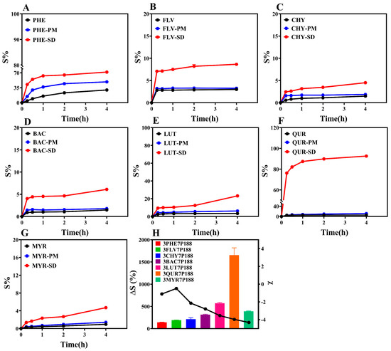 The ultimate goal of this study is to enhance the drug dissolution rate by preparing CSD formulations. Therefore, we conducted powder dissolution experiments on the prepared CSDs (Figure 8). The research findings indicate that the cumulative percentage dissolution rates at 4 h for CSD systems with a drug loading of 30% are all higher than those for pure drugs. To provide a more intuitive comparison of the dissolution-enhancing effect of CSD systems on flavonoid drugs, we selected the percentage change in cumulative dissolution at 4 h, denoted as ∆S (%), as an index for comparison (Equation (11)). The results show the following trend: QUR (1653.92 ± 231.21%) > LUT (571.51 ± 28.62%) > MYR (388.12 ± 12.43%) > BAC (315.07 ± 12.02%) > CHY (211.76 ± 45.43%) > FLV (188.85 ± 6.92%) > PHE (141.19 ± 7.07%) (Figure 8H). ∆S (%) is directly proportional to the degree of interaction. The higher ∆S (%) for FLV with a drug loading of 30% compared to PHE may be due to rapid crystallization with P188 in the crystallization kinetics. Notably, MYR’s lower dissolution is inconsistent with the changing trend observed in other drugs. The lower degree of dissolution of MYR may be due to the following reasons: (1) Research suggests that its in vitro dissolution is related to drug loading [69]. While 30% of drug loading was selected in order to standardize the drug loading in this study, it may not be the optimal drug loading in the dissolution of MYR under this condition, which does not reflect the optimal dissolution behavior; (2) The powder dissolution behavior of a drug is affected by a number of factors, such as the particle size of the drug, the nature of the drug, with dissolution conditions, etc. [10]. Whereas this study mainly illustrates the variability in terms of variation in drug particle size, there may be other factors that combine to influence the powder dissolution behavior, resulting in little variability.