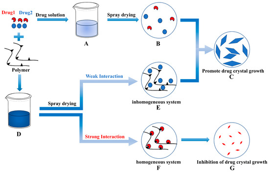 The relationship between interaction and crystal crystallite size is depicted in Figure 9. When a drug dissolves in a solvent to form a homogeneous solution, the crystallization process involves initial nucleation followed by crystal growth, which occurs after solvent evaporation using spray-drying techniques. However, a non-uniform state can emerge after solvent evaporation when the drug and polymer dissolve together and interact. In cases where the interaction between the drug and polymer is weak, the drug exhibits a crystallization trend similar to that of a pure drug. Conversely, when the interaction between the drug and polymer is strong, the polymer inhibits the drug’s crystal growth through a series of interaction mechanisms, resulting in relatively slow drug crystal growth and a reduction in crystal crystallite size.