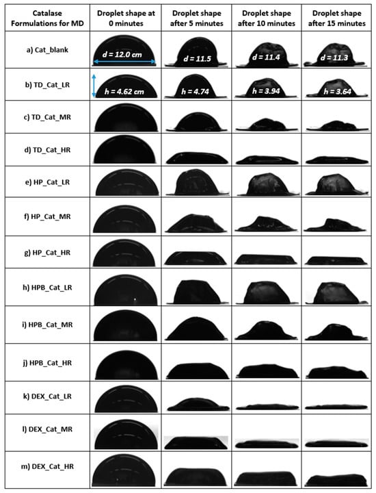 (a–m): The development of droplet morphology during MD for 15 min of different formulations containing the blank with pure catalase without saccharides (a) and catalase with different types of saccharides (b–m) are presented. Although pictures were taken at minute intervals, only selected time points are shown for simplicity. The values for the determined diameters and heights (in cm) are shown as exemplary for some of the droplets only. MD = miniaturized drying, HR = high ratio, MR = medium ratio, LR = low ratio.