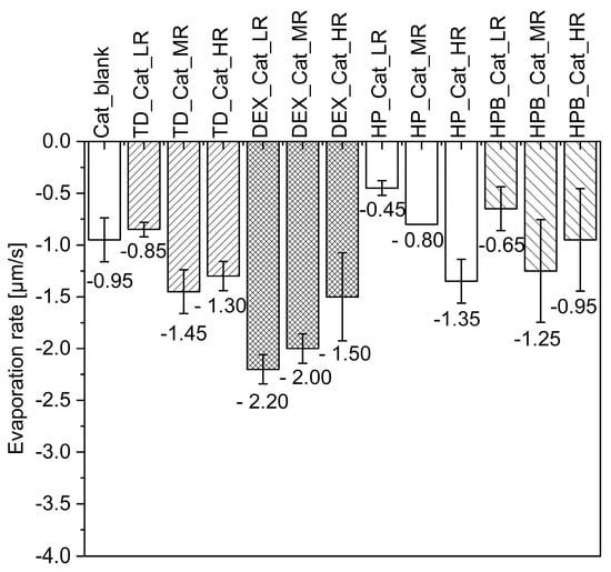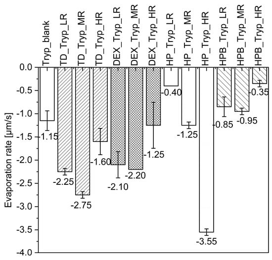 Applied at LR, however, all saccharides showed the lowest evaporation rates, which increased from LR to MR, except for DEX, which resulted in the highest evaporation rate at LR (−2.20 µm/s) that decreased from LR to HR (Figure 2). The overall lowest evaporation rate was observed for HP at LR (−0.45 µm/s). In contrast, the highest evaporation rates were observed for all DEX samples (from −2.20 µm/s at LR to −2.00 µm/s at MR to −1.50 µm/s at HR). For TD and HPB, the lowest evaporation rates were observed at LR, while the highest were observed at MR. The following formulations showed lower or higher evaporation rates during MD: HP at LR (−0.45 µm/s) < HPB at LR (−0.65 µm/s) < HP at MR (−0.80 µm/s) < TD at LR (−0.85 µm/s) < HPB at HR (−0.95 µm/s) = blank (−0.95 µm/s). As shown in Supplementary Figure S1, the AR for dried catalase droplets containing DEX was lower with lower DEX ratios. This aligns with the observations that dried catalase droplets with DEX were generally relatively flat (Figure 1k,m). The highest AR was observed with HP at a low ratio, resulting in a hat shape (Figure 1e).