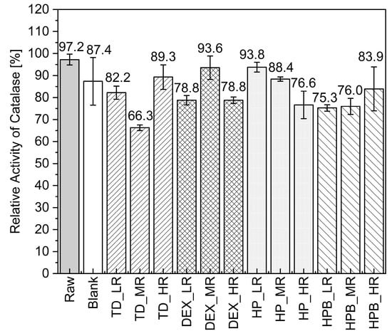 Drying catalase droplets without adding saccharides (Blank) did not lead to a loss in activity. The relative activities obtained after MD of the different catalase formulations with and without saccharides are collectively shown in Figure 3. For TD-containing formulations, no clear trend could be observed. Surprisingly, TD at MR even notably decreased catalase activity (66.3%), although this disaccharide is well-known to be very good at protecting proteins during drying [].