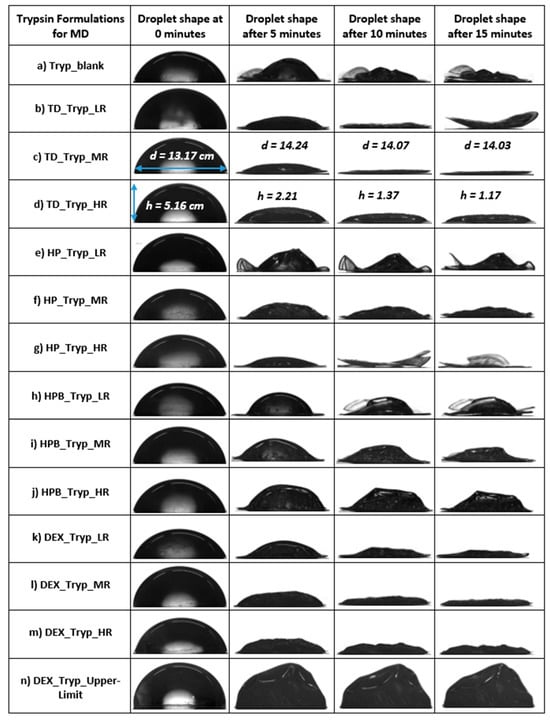 (a–n): The development of droplet morphology during MD for 15 min of different formulations containing the blank with pure trypsin without saccharides (a) and trypsin with different types of saccharides (b–m) are presented. Although pictures were taken at minute intervals, only selected time points are shown for simplicity. The values for the determined diameters and heights (in cm) are shown as exemplary for some of the droplets only. MD = miniaturized drying, HR = high ratio, MR = medium ratio, LR = low ratio.