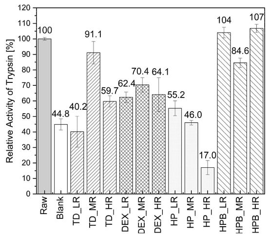 All other ratios of TD and HP, as well as DEX and HPB applied in their specific concentrations, were shown to improve the relative activity of trypsin. HPB seemed to work the best in keeping trypsin active during drying, resulting in relative trypsin activities between 84.6% (at MR) and 107% (at HR) for all three different saccharide ratios applied. In relation to HPB, the higher substituted HP was not as successful in stabilizing trypsin during MD, resulting in rather low relative trypsin activities between 17.0% (at HR) and 55.2% (at LR). When trypsin was dried in the presence of DEX, the relative activities observed were between 62.4% (at LR) and 70.4% (at MR). Therefore, compared to trypsin dried without the addition of saccharides, DEX managed to preserve the activity of trypsin during MD. Especially using DEX at MR resulted in the highest trypsin activity compared to the other DEX ratios. Using the smallest saccharide TD in the formulations at MR resulted in higher activities of 91.1% than using it at HR, which led to a relative activity of 59.7%. For the formulations containing TD or DEX, the highest activities were obtained at MR, while with HP and HPB, a different behavior was observed. Namely, the activity either decreased with increasing content (for HP) or dropped only when applied at MR (for HPB), when compared to HPB at LR and HR, which both resulted in higher activities (Figure 6).