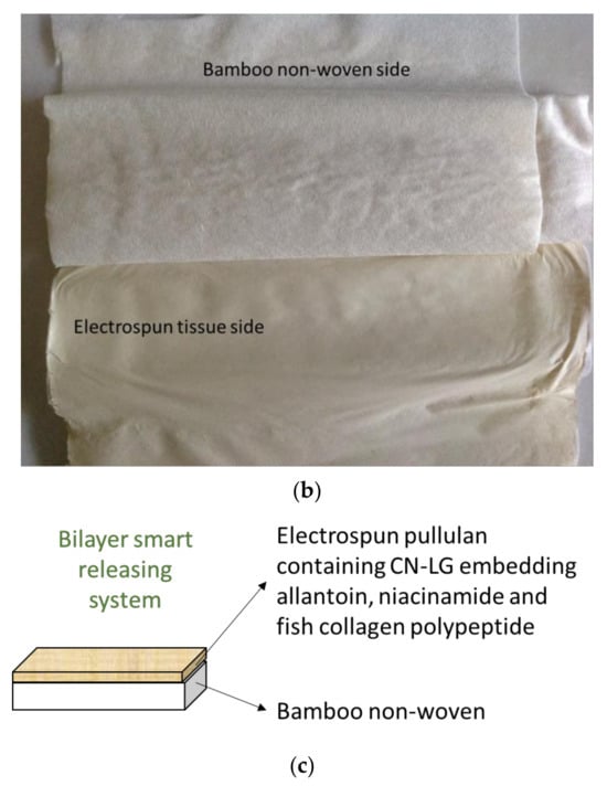 The electrospinning process has been used for producing smart delivery systems because it can produce smart, nanostructured and sustainable tissue carriers [,,]. These innovative vehicles that are produced using micro-nanofibers can embed chitin nanofibril–nano-lignin (CN-LG) complexed particles, which can encapsulate selected active ingredients [,]. The productivity of electrospun tissue has enormously increased in the last decade but it remains to be a critical point for industrial applications []. Therefore, application of a thin electrospun functional layer onto a suitable nonwoven substrate can result in an innovative tissue for smart release with better scalability. Bamboo nonwoven textiles are very well known because of their interesting properties []. Bamboo fibers have various and numerous micro gaps. With respect to cotton, bamboo increases its moisture absorption and makes it softer. Bamboo fiber is highly durable, stable and tough, and it has high tensile strength. It is also sustainable and biodegradable. Moreover, bamboo fiber tissues are antifungal, antibacterial, bacteriostatic, hypoallergenic, hydroscopic, a natural deodorizer and resistant against ultraviolet light []. Due to its antibacterial feature, it is used for making masks, bandages and sanitary napkins. The tissue, after the application of the bilayer system, can be recycled or composted thanks to the durability and biodegradability of the bamboo fibers, respectively.