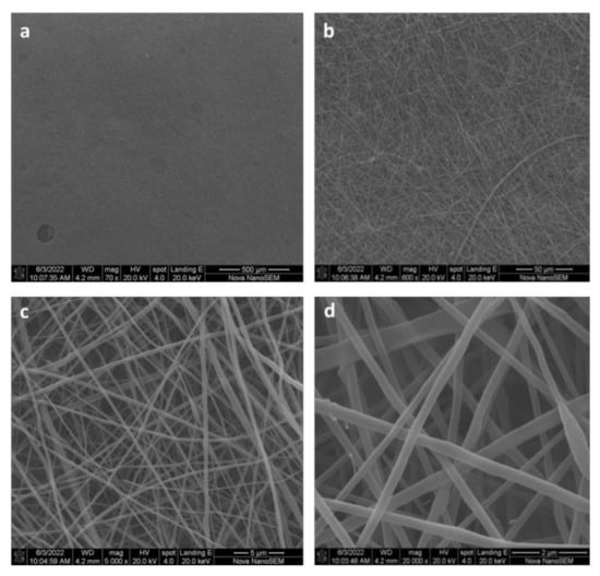 SEM micrographs showing the morphology of the electrospun pullulan tissue: (a) Magnification 70×; (b) magnification 600×; (c) magnification 5000×; (d) magnification 20,000×.