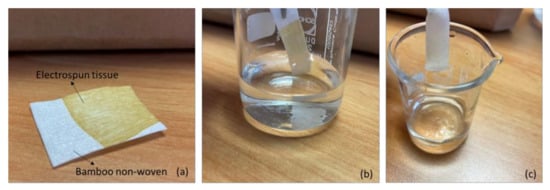 Qualitative release tests supported by ATR-IR characterization were carried out. Saliva is a colorless, slightly stringy liquid with a reaction close to neutral (pH 6.6 on average), made up of 98.7% water, 0.8% inorganic substances (chlorides, carbonates, bicarbonates, phosphates, etc.) and 0.5% from organic substances (mucin, enzymes, especially ptyalin, albumin, etc.). To mimic saliva, a solution of distilled water containing 0.8% sodium chloride was considered and 0.1 mL of a water solution of HCl 0.0025 M was added to 1 L of solution to reach a pH of 6.6. A solution of 0.9% NaCl and distilled water was also used for comparison. One strip of the electrospun brown tissue deposited onto white bamboo tissue (10 mm × 30 mm) was rinsed in 10 mL of liquid. After 10 s, the strip was removed from the liquid and the color was analyzed. The test was repeated two times for the three liquids and also for the distilled water.