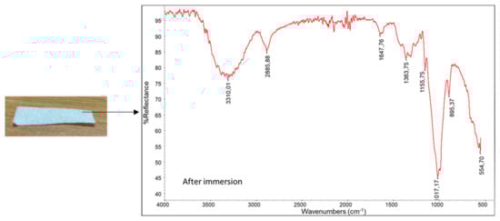 Strips of the bilayer system were immersed in distilled water, saline solution and in the liquid mimicking human saliva. After 10 s of immersion, the strips were removed, and they were white in color (Figure 4). The liquid remained almost transparent, indicating that the pullulan layer had the capacity to form a homogeneous solution/suspension in water. Then, the strips were dried and characterized by ATR spectroscopy (Figure 5).