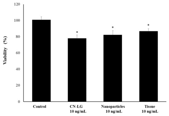 According to our previous studies, the HaCaT keratinocyte cell line was grown in 9BM medium supplemented with 10% (v/v) fetal bovine serum at 37 °C and 5% CO2 []. Then, 10 mg/mL of nanoparticles and tissue were added to the cell culture and incubated for 48 h in a 37 °C humidified atmosphere containing 5% CO2. Viability was assessed by using the modified MTT method. Tests were carried out in triplicate.