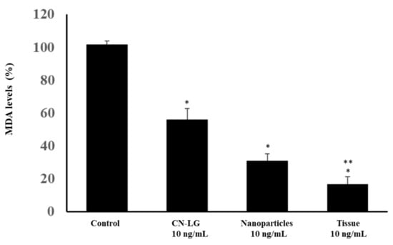 The antioxidant activity of CN-LG nanoparticles, CN-LG-entrapping active molecules and the final tissue based on pullulan and bamboo fibers, were evaluated in vitro by using the total antioxidant potential (TRAP) technique. The principle of the method is based on the peroxidation of linoleic acid by the oxidant compound 2,2azobis-2,4-dimethylvaleronitrile (AMVN) with the formation of malondialdehyde (MDA) as the final product. Peroxidized linoleic acid was used as a control. MDA formation was detected, and the results are reported in Figure 7.