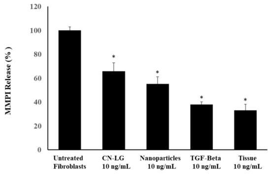 According to our previous studies [], the human fibroblast culture, after 24 h of incubation, was incubated for a further 2 h after the addition of 600 nM of H2O2, to obtain aged cells. Soon after, the medium was removed and replaced by fresh medium. After maintaining the culture for a further 144 h and substituting the medium after 70 h, both aged fibroblasts and untreated fibroblasts were detached with trypsin, seeded in 96-well microplates and cultured for 24 h. Soon after, the culture medium was replaced with DMEM medium, containing either transforming growth factor (TGF-beta) or PUL tissue, CN-LG carrier, CN-LG particles and the produced final tissue at a dose of 10 nM/mL, incubated for 72 h and compared to the untreated control. The MMPI release was tested in triplicate using an ELISA kit.