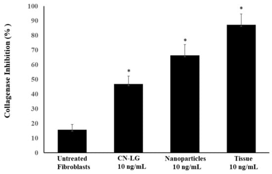 Percentage of inhibitory activity vs. collagen degradation in fibroblast cultures incubated with collagenase enzyme after treatment with CN-LG carrier, nanoparticles or the final tissue. Significant vs. control (* p < 0.005).