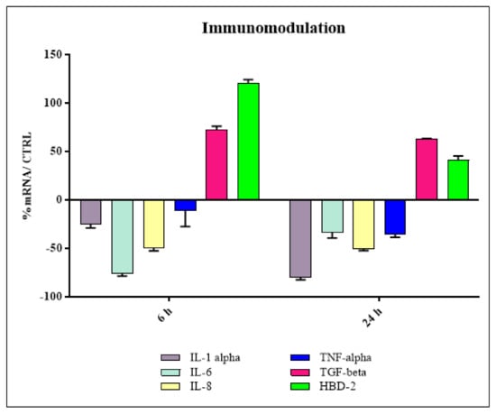 The immunomodulatory tests (reported in Figure 11, including their standard deviation bar) show that the fibers present strong anti-inflammatory activity, as they significantly downregulated all the proinflammatory cytokines tested and upregulated the anti-inflammatory cytokine TGF-beta. In addition, the fibers were able to strongly stimulate HBD-2 expression, suggesting the presence of indirect antimicrobial activity. In addition, the Alamar Blue assay shows that the fibers did not cause any type of damage to cell viability. In fact, the ABRED value result was 100% for the control and 110% for the tissue sample.
