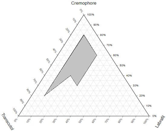 Pseudo-ternary phase diagram created using ProsSim software 1.0 for the selected system (Labrafil as the oil, Cremophor EL as the surfactant, and Transcutol as the co-surfactant.), showing the nano-emulsification area in gray.