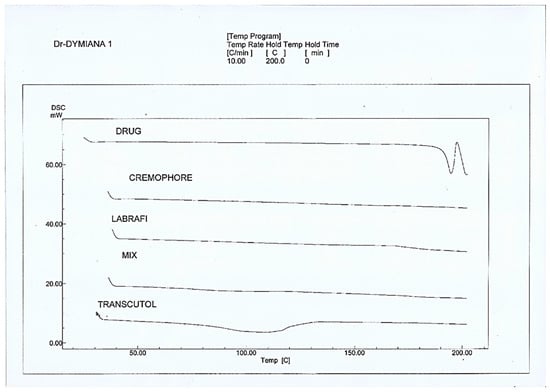 Thermal analysis of SA, Labrafil, Cremophor El, Transcutol, and the optimized SA-SNE mixture was carried out using a differential scanning calorimeter (DSC) (Shimadzu, DSC 60 TSW 60, Kyoto, Japan). The study was conducted within the 50–200 °C range at a scanning rate of 10 °C/min. An empty pan was used as a reference [].