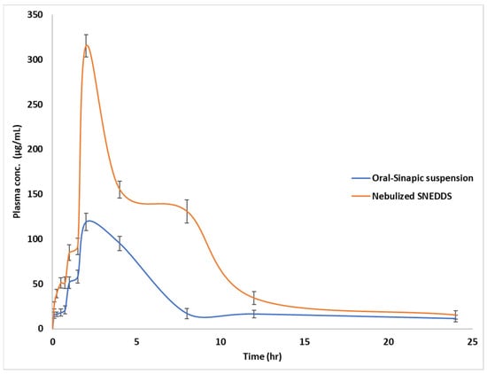 Mean sinapic acid plasma concentration–time curves following administration of oral sinapic acid suspension and nebulized SNE optimized formula to Wistar albino rabbits (n = 6) at (p < 0.05).