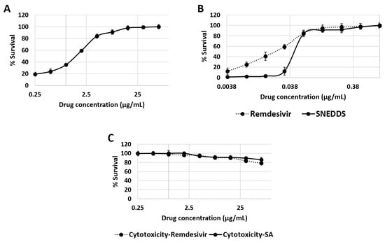 The antiviral screening was performed using SARS-CoV-2 (wild strain) virus at the Egyptian Company for Production of Vaccines (VACSERA) using strain hCoV-19/Egypt/NRC-3/2020 isolate, which was isolated in the Ministry of Health Laboratories for diagnostic reasons in May 2020. The cytotoxicity and the antiviral activities were investigated using Vero E6 cells (Sigma Aldrich, St. Louis, MO, USA). Then, serial concentrations of the test compounds were incubated with Vero E6 and then infected with SARS-CoV-2 (hCoV-19/Egypt/NRC-3/2020 isolate) at an MOI (multiplicity of infection) of approximately 0.5. DMSO was used as a solvent control. The antiviral screening was performed in a Biological Safety Cabinet Class III BCBS-502 (Biolab Scientific Ltd., Suite 300, Toronto, ON M1V 0B8, Canada) at VACSERA Co., Giza, Egypt. The detailed quantitative real-time PCR antiviral assay results can be found in the Supplementary Materials.