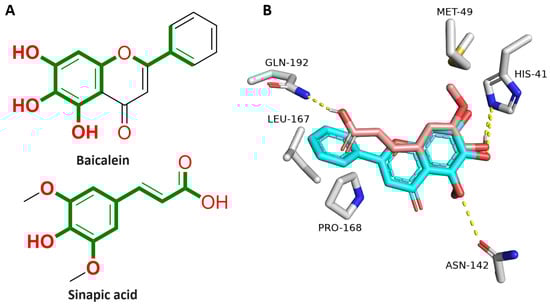 The following supporting information can be downloaded at: https://www.mdpi.com/article/10.3390/pharmaceutics15112531/s1, Figure S1: Initial model used in the GaMD simulations. Sinapic acid is shown as green spheres and Mpro as cyan ribbons. Golden-yellow balls represent the Na+ and Cl− ions.