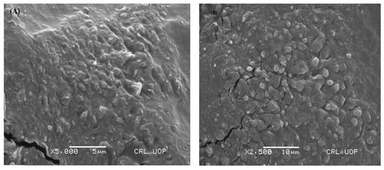 SEM analysis was done at resolutions of 5 and 10 µm to study the surface morphology of the optimized MT-8 formulation, as illustrated in Figure 1. An SEM is a form of electron microscope that examines a sample with a concentrated beam of electrons to create photographs [55]. SEM images of the developed transethosomes represented almost spherical, homogeneous, and uni-lamellar nano-vesicles. The vesicle surface was smooth. Spherical-shaped vesicles predominated. Figure 1 depicts the active drug loaded in transethosomes as distributed white particles under high magnification across the network. The combination of 40% ethanol and 85:15 lipid/edge activator with increased and high encapsulated drug concentration resulted in spherical-shaped transethosomes with a smooth surface.