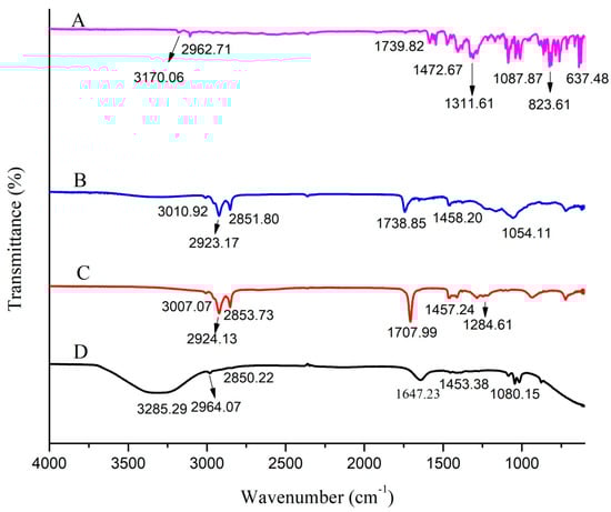 FTIR spectra of MCNR (A), lecithin (B), oleic acid (C), and optimized formulation MT-8 (D).
