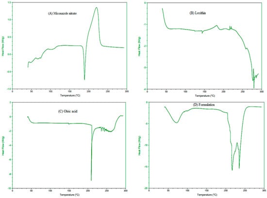 DSC thermograms of MCNR (A), lecithin (B), oleic acid (C), and optimized formulation (D).