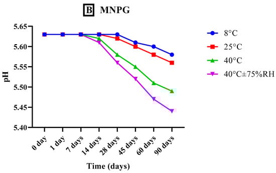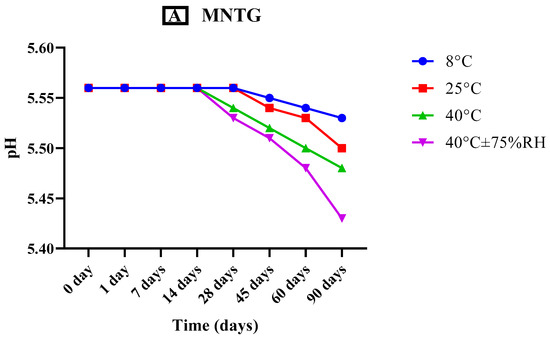 Additionally, we noted that MNTG began to turn off-white at the end of the second month at higher temperatures (40 °C and 40 °C ± 75% RH) and turned light yellow from the third month. This could be explained by the lipid and transethosomes instability at elevated temperatures and humidity. During the first two months, smoothness remained constant, but by the third month, the MNTG and MNPG formulations at high temperatures had begun to thin, due to which their viscosity decreased. Throughout the investigational period, neither liquefaction nor odor change was observed in MNTG or MNPG. Similarly, no variation in appearance was noticed, as reported in Table 4.